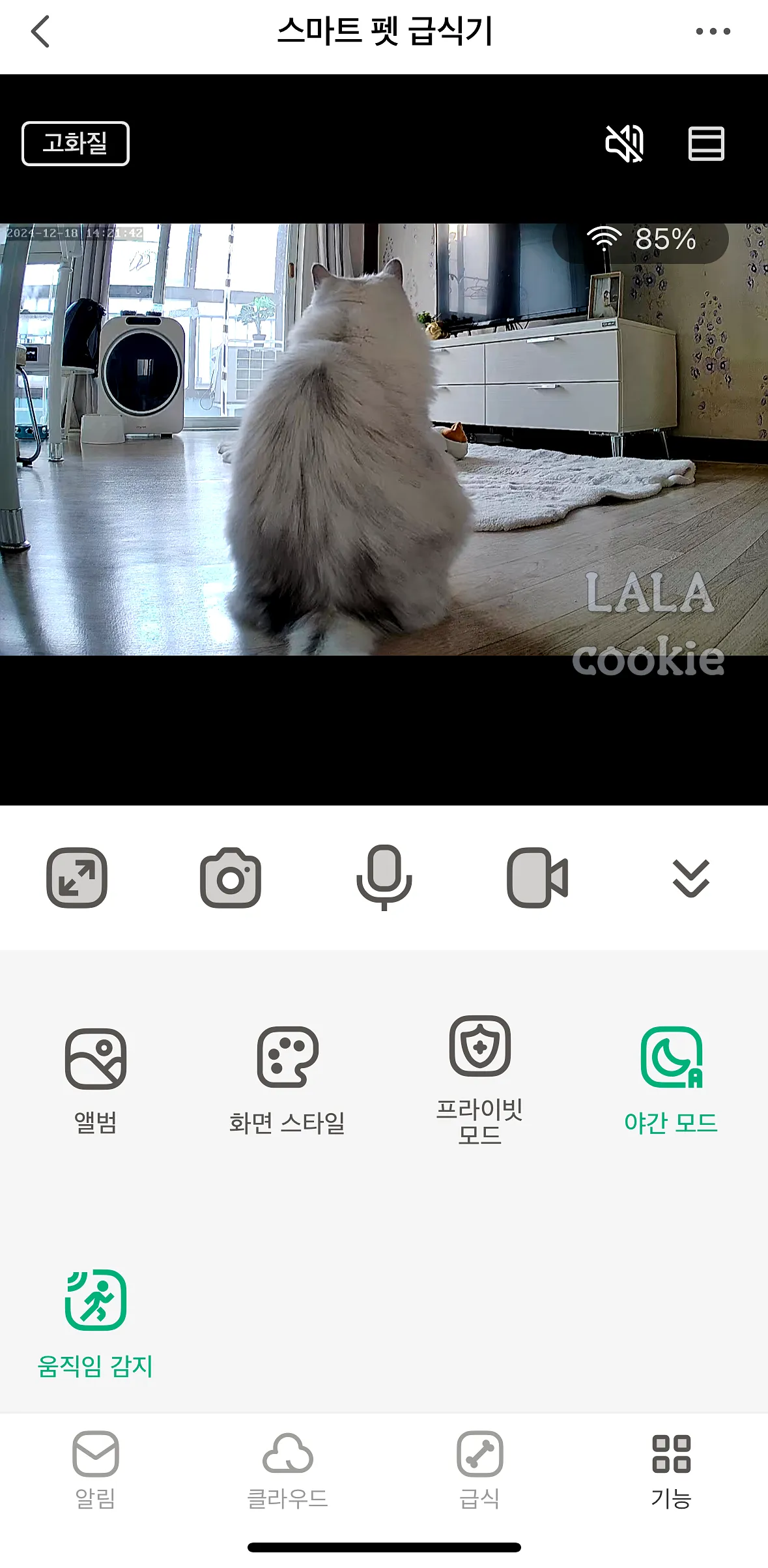 기능 | 마이크 있어 화상채팅 가능 카메라 1080p 고화질 카메라 끔 기능 어플 연동(다른 가족도 가능) 급식 횟수 최대 20회 급식 확인 가능 움직임 감지 기능 야간 모드 지원 목소리 녹음 분리 세척 가능 제습제 포함 |